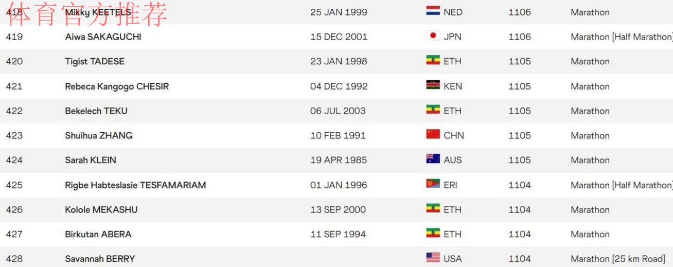 • 世界田联拒绝承认张水华最好成绩,目前暂排名世界第423中国第22